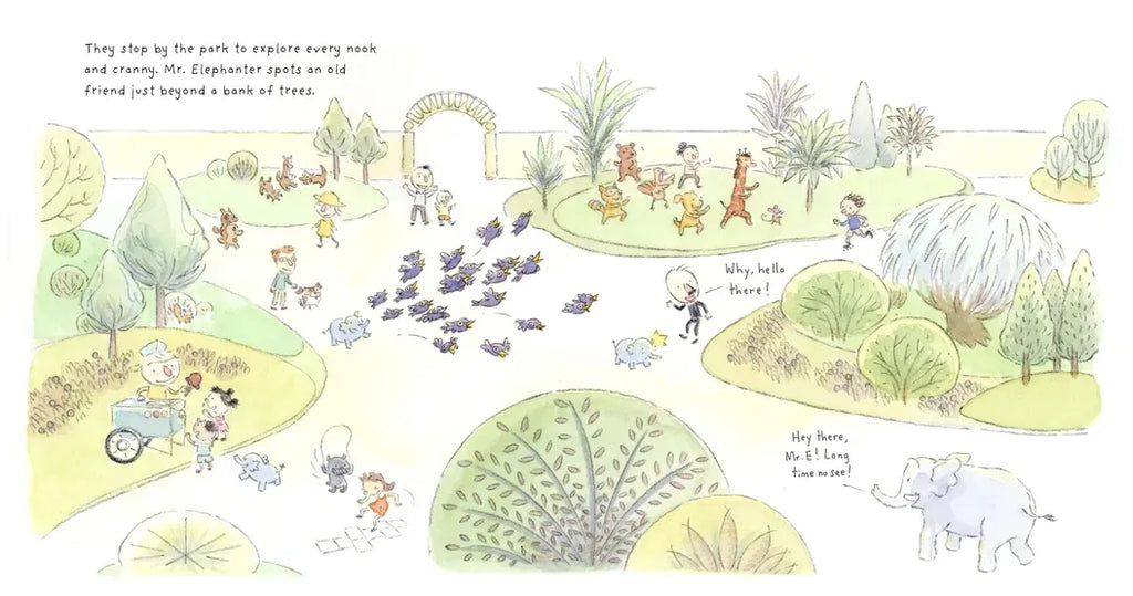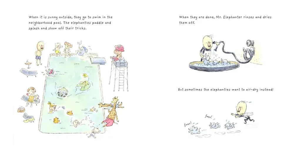 Early every morning, Mr. Elephanter arrives at the Elephantery to care for his diminutive charges, who greet him with toots and trumpets. There are hugs and hellos all around! They all eat pancakes, paddle and splash in the neighborhood pool, and parade through the bustling city. After naps, Mr. Elephanter pretends he’s a tunnel, tower, and bridge, while the elephanties play all around him. In fresh watercolors exuding warmth and whimsy, Lark Pien introduces the doting Mr. Elephanter — and the most adorable miniature creatures you’ll ever meet.