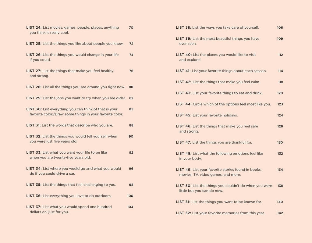 Each list is a safe space for kids to express their feelings, explore interests and hobbies, and record thoughts, hopes, and dreams. Whether your child wants to fill it out on their own or complete each list with a loved one, this journal is sure to spark great conversations and ideas.