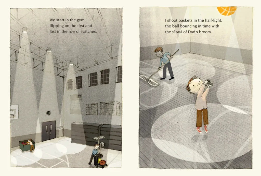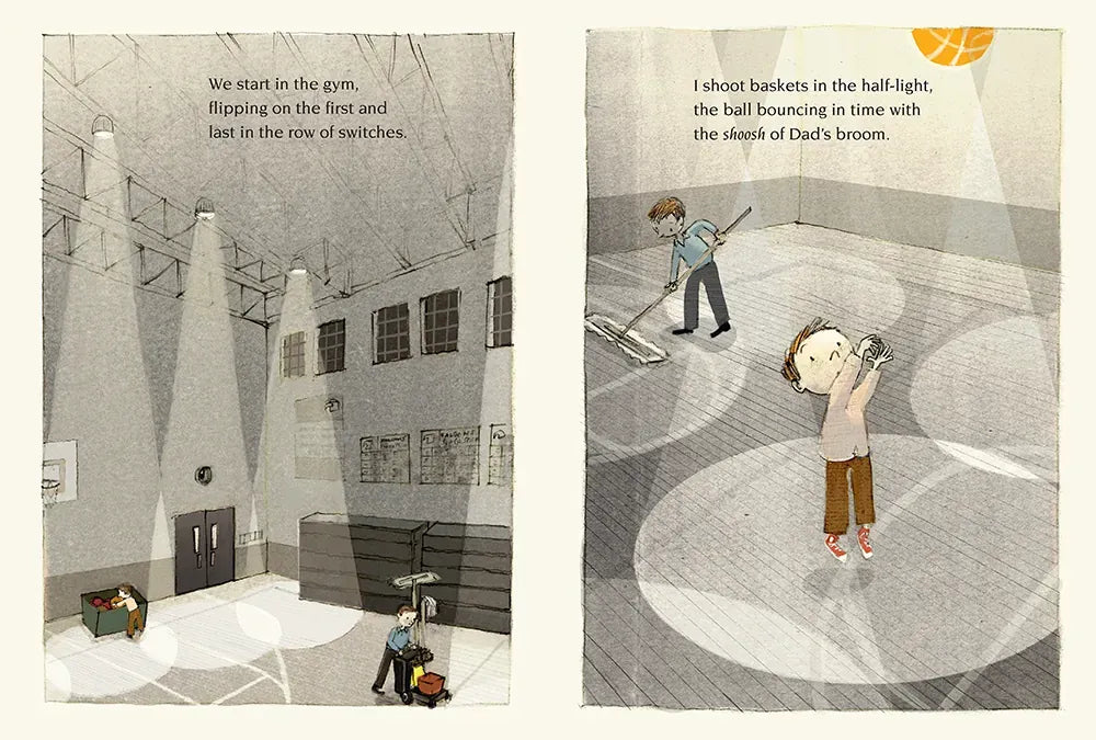 When the sun sets, Dad’s job as a school custodian is just beginning. What is it like to work on a Friday night while the rest of the city is asleep? There’s the smell of lilacs in the night air, the dusky highway in the moonlight, and glimpses of shy nighttime animals to make the dark magical. Shooting baskets in the half-lit gym, sweeping the stage with the game on the radio, and reading out loud to his father in the library all help the boy’s time pass quickly. But what makes the night really special is being with Dad. Newbery Medalist Karen Hesse’s quietly powerful story of a boy and his father is tenderly brought to life by G. Brian Karas in this luminous tribute to an enduring, everyday sort of love.