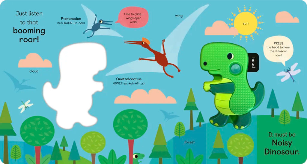Explore the prehistoric world of the dinosaurs in this interactive book filled with engaging rhymes, illustrations, and a tactile dinosaur featuring corresponding sounds. Little ones will love pressing the soft, silicone buttons to hear an entertaining range of sounds, from a heavy foot stomping on the ground to a tail swishing back and forth. The tactile features and sounds promote learning through fun!