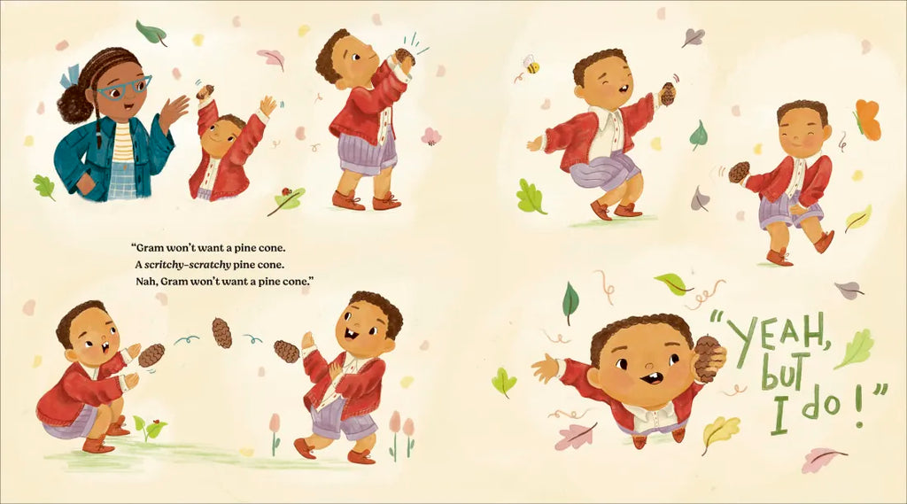 It’s Gram’s birthday, and the grandkids can’t wait to celebrate with her. There’s just one thing missing: a gift! So on their way to the party, the search is on. They spot lots of interesting things—a scritchy-scratchy pine cone, three jingly-jangly quarters, some clicky-clacky stones—but are any of them good enough for Gram?