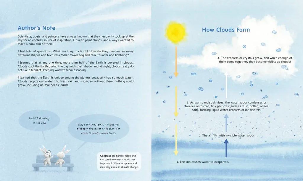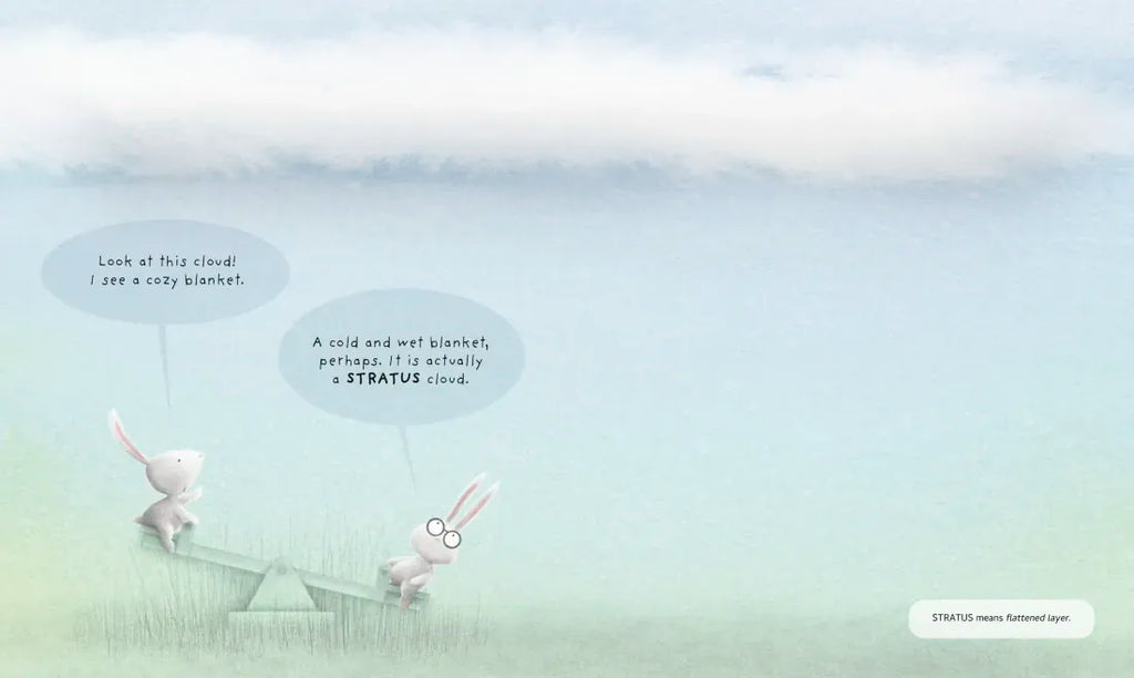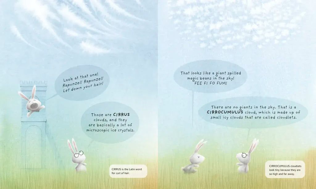 Two curious bunnies enjoy watching clouds go by. But when they look at the sky, they each see something completely different! While one bunny likes to use his imagination and sees cotton candy or whipped cream, the other bunny can only see the science behind them. Together they learn that cloud watching is much more fun when they can see it through each other's eyes.