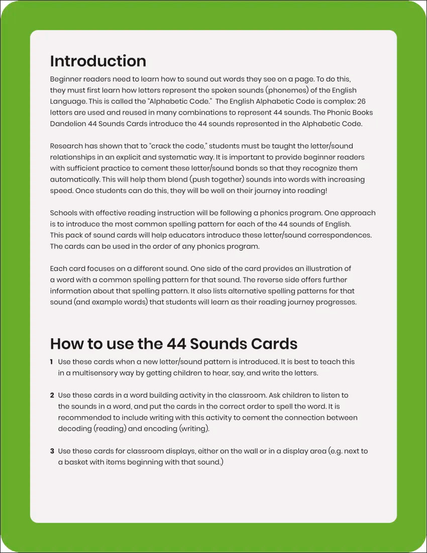 - Full-color cards which provide a clear image for each of the 44 sounds.