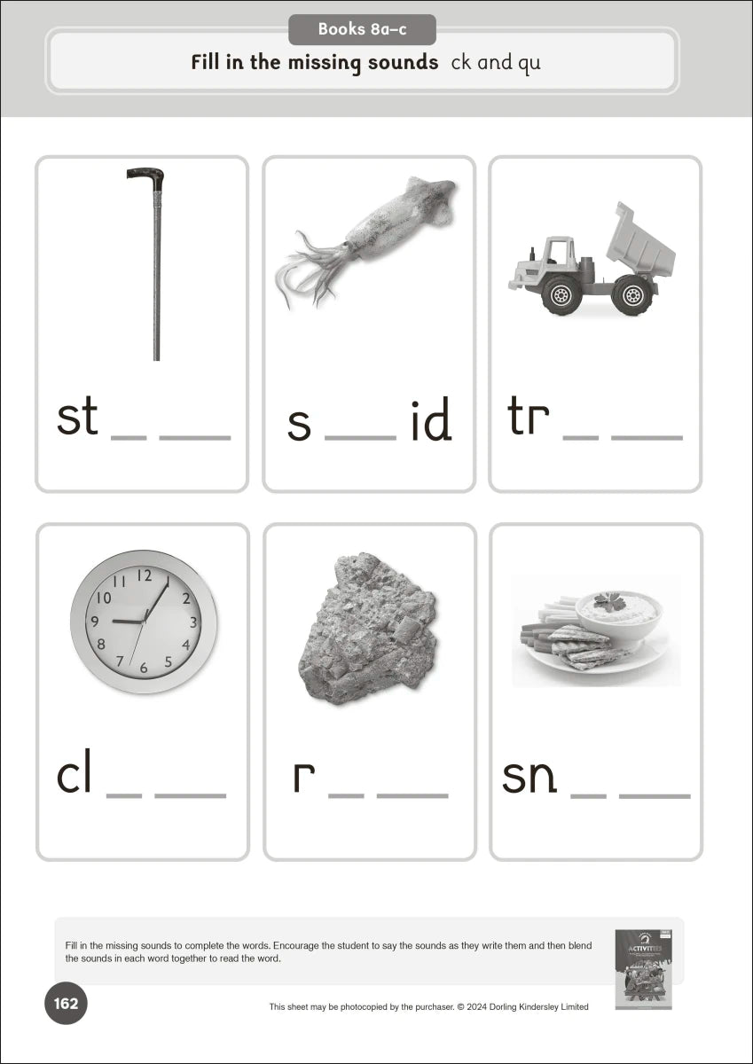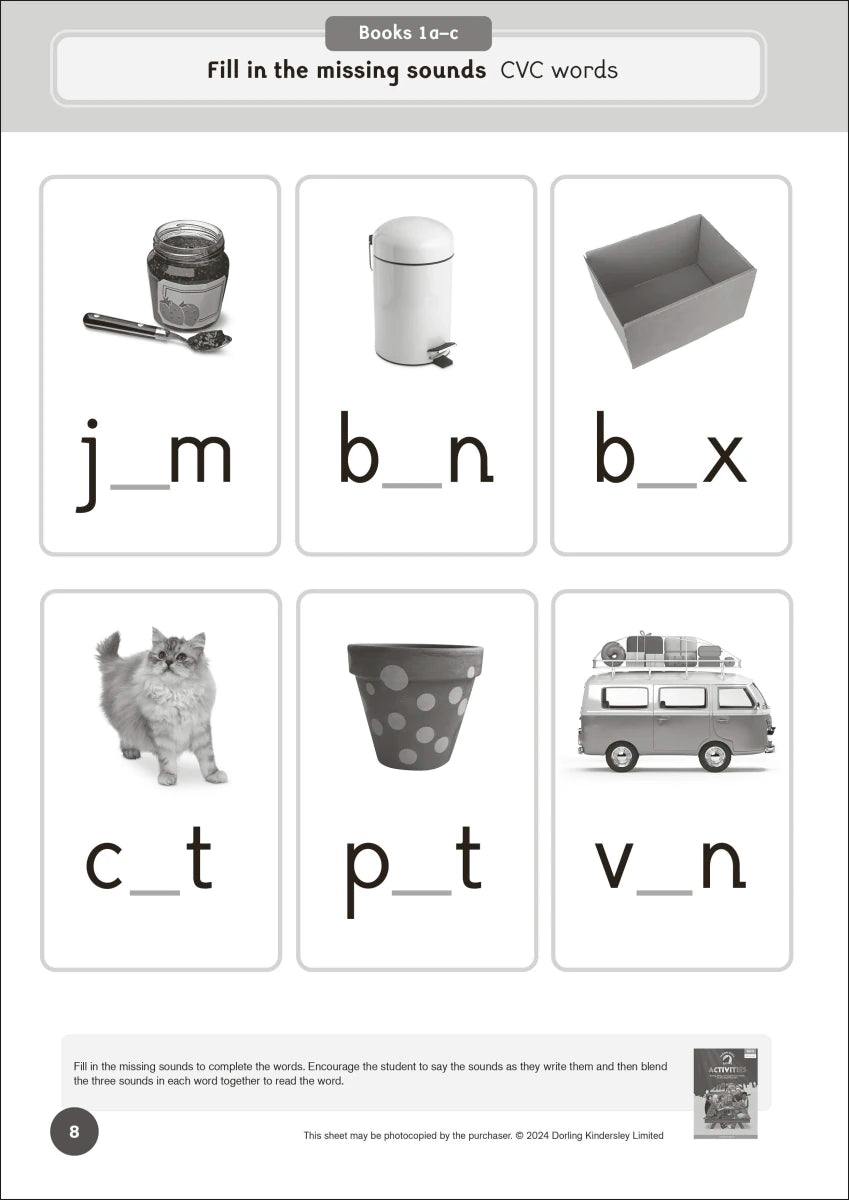 - CVC, VCC, CVCC, CCVC, and CCVCC words, introducing adjacent consonants and consonant diagraphs.