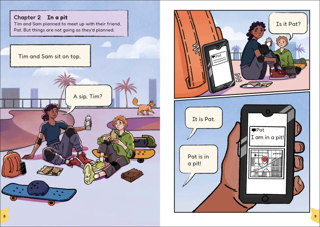 Eight stories bound into one graphic novel format follow the adventures of a diverse group of teenage friends in a skateboarding team called the Sun Cats. Each story practices the initial sounds of the alphabet at CVC-level text.