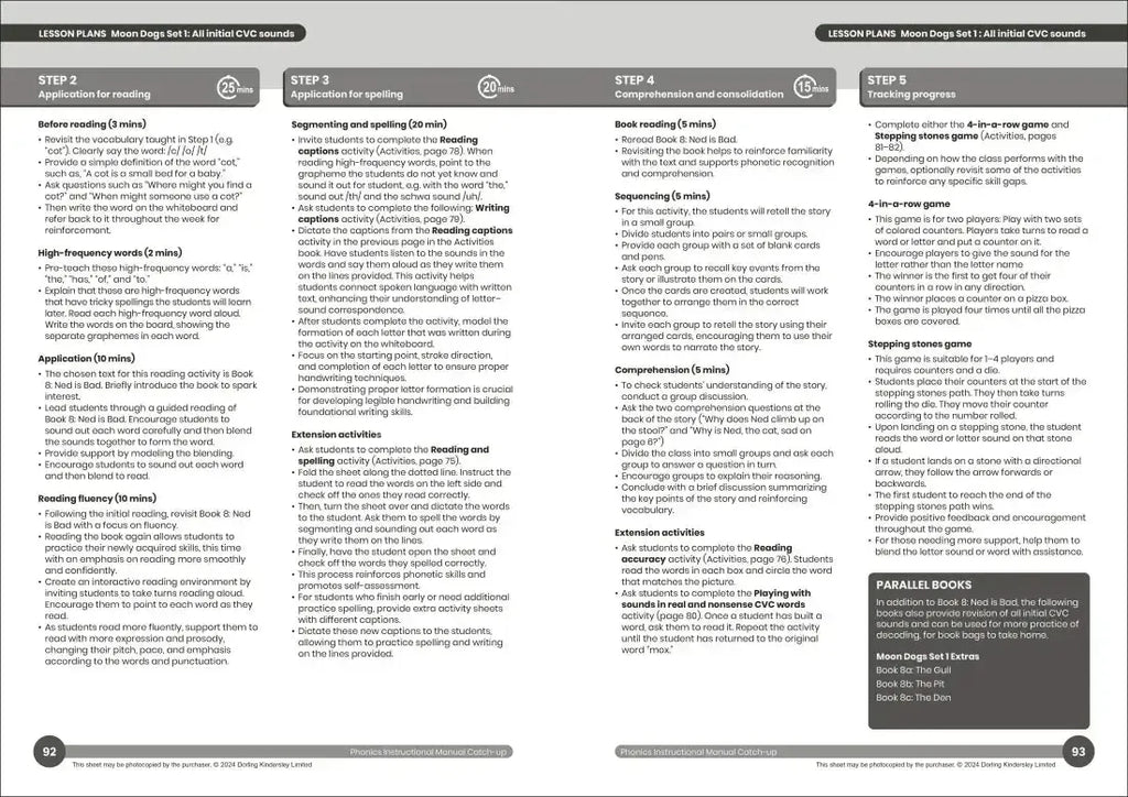 Each lesson is divided into five main sections: Revision, Preparation, Application, Consolidation, and Tracking Progress. This enables each lesson to meet the phonics requirements, as well as more general literacy requirements, and ensure students are concurrently learning how to read for meaning from the start.