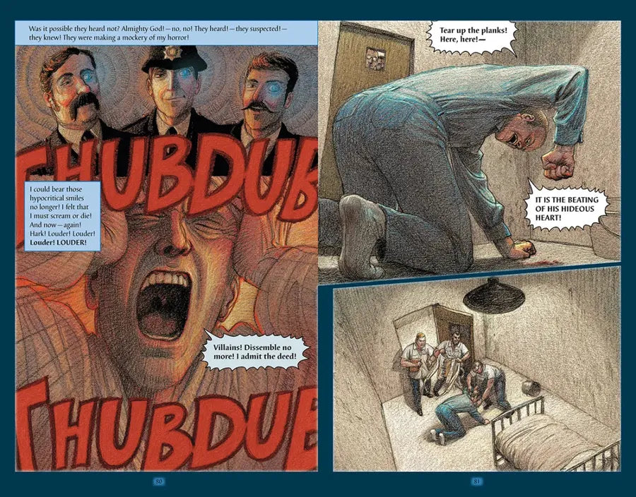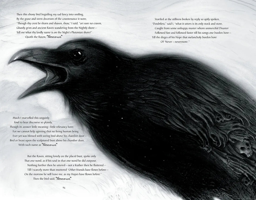 In “The Cask of Amontillado,” a man exacts revenge on a disloyal friend at carnival, luring him into catacombs below the city. In “The Masque of the Red Death,” a prince shielding himself from plague hosts a doomed party inside his abbey stronghold. A prisoner of the Spanish Inquisition, faced with a swinging blade and swarming rats, can’t see his tormentors in “The Pit and the Pendulum,” and in “The Tell-Tale Heart,” a milky eye and a deafening heartbeat reveal the effects of conscience and creeping madness. Alongside these tales are visual interpretations of three poems — “The Raven,” “The Bells,” and Poe’s poignant elegy to lost love, “Annabel Lee.” The seven concise graphic narratives, keyed to thematic icons, amplify and honor the timeless legacy of a master of gothic horror.