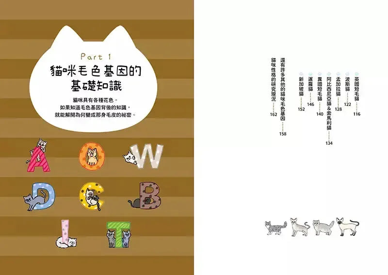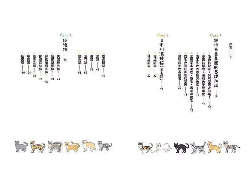 書中詳細介紹7種米克斯及14種純種貓,除了分析牠們在毛色方面的基因表現外,也藉由行為學理論,解析不同花色的貓咪在性格上是否有顯著差異,更全面地介紹了牠們的歷史由來、生活喜好、健康問題以及獨特魅力。