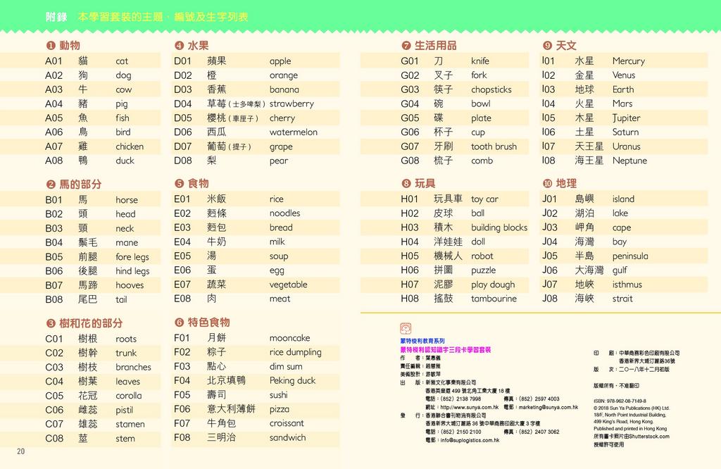 動物、馬的部分、樹和花的部分、水果、食物、特色食物、生活用品、玩具、天文和地理。