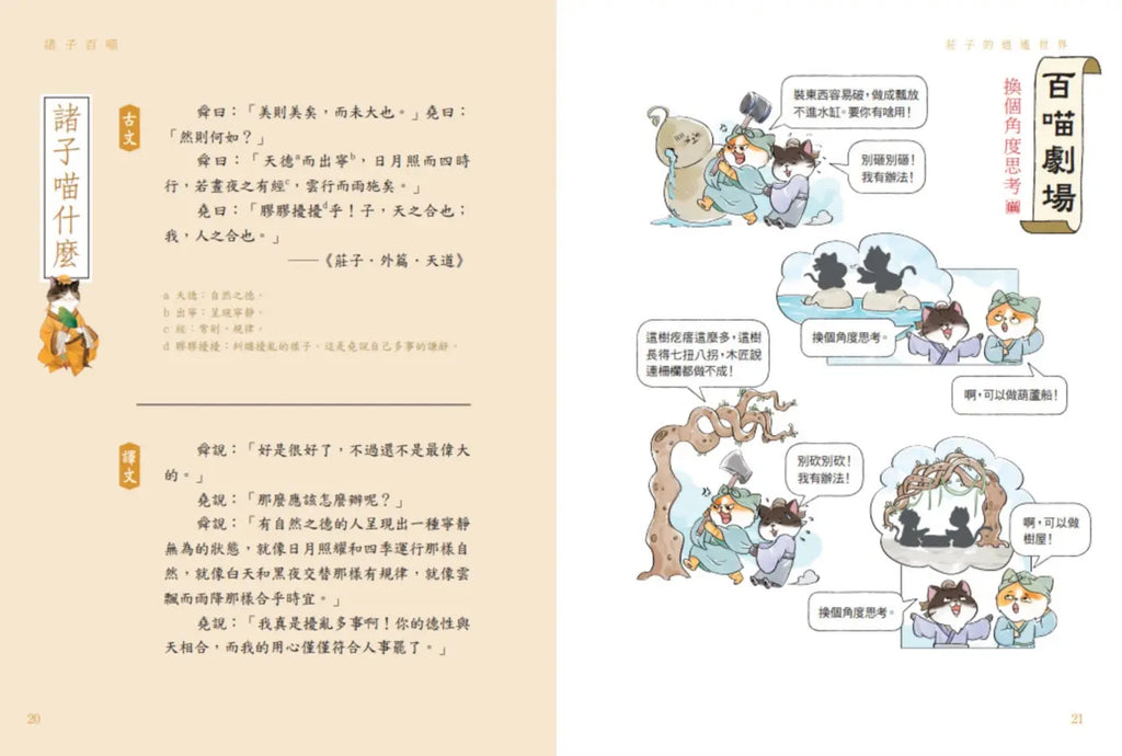 5.多版塊設計,將趣味與經典融為一體。爆笑的手繪漫畫「百喵劇場」和正文插圖,一邊展示諸子百家的花式賣萌和吐槽,讓諸子形像生動立體、親切可愛。 「喵夫子說」補充大語文知識,拓展視野,激發興趣。「諸子喵什麼」展現相關古文原文、注音、註釋和譯文,讓古文不再可怕。