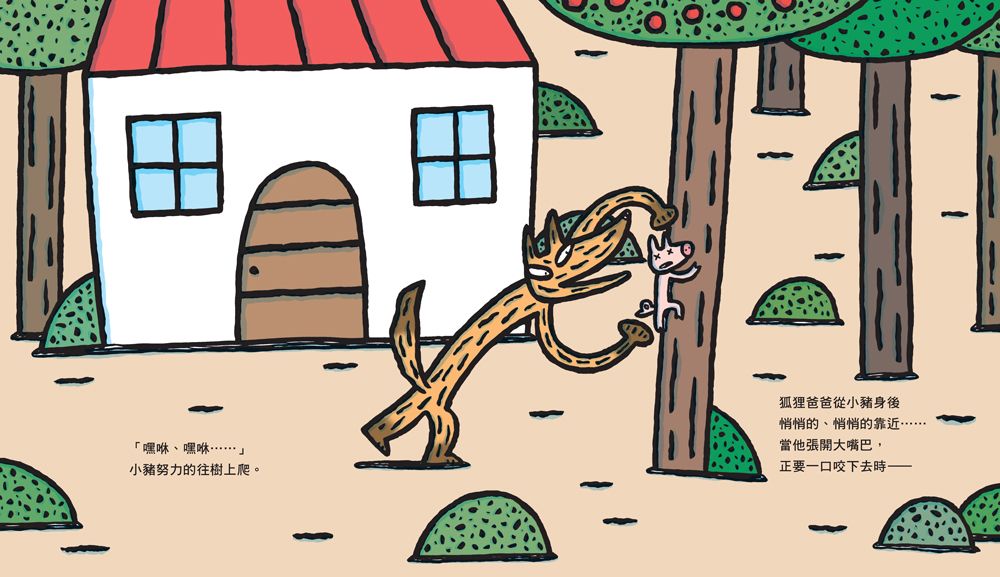 有一天,狐狸爸爸笑嘻嘻的對孩子說:「我要出門抓小豬嘍!今天會有美味的小豬可以吃!」於是狐狸爸爸翻山越嶺來到小豬住的地方,首先,他遇到一隻在努力爬樹採蘋果的小豬。當他張開大嘴巴,正要一口咬下去時──