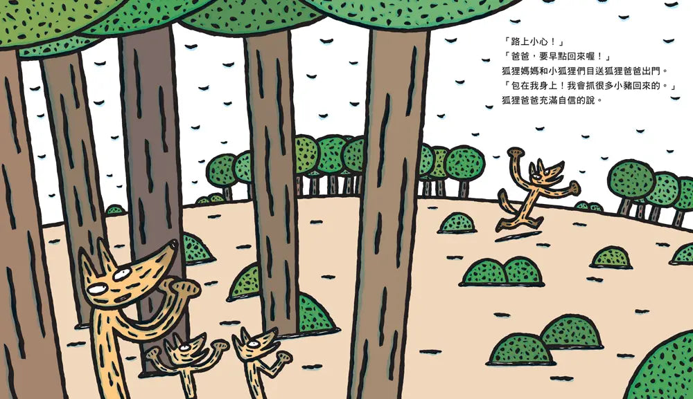 接著,狐狸爸爸遇到在幫花朵澆水的小豬、在屋頂漆油漆的小豬……究竟,狐狸爸爸有沒有成功吃到小豬,為自己的孩子們帶回豐盛的小豬大餐呢?