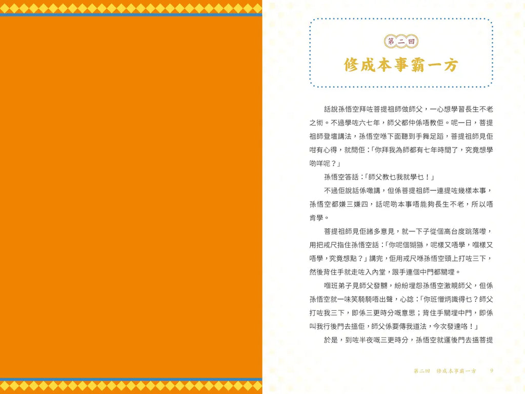 這本全用粵語文字改編而成的《西遊記》,從原著中精選四十五回內容,保留了主要的精彩故事和豐富的古代歷史文化內容,也為讀者帶來生動有趣、原汁原味的粵語講古,能讀能聽,方便讀者隨時閱讀。而生動傳神的插畫,也可提升閱讀趣味,幫助理解。