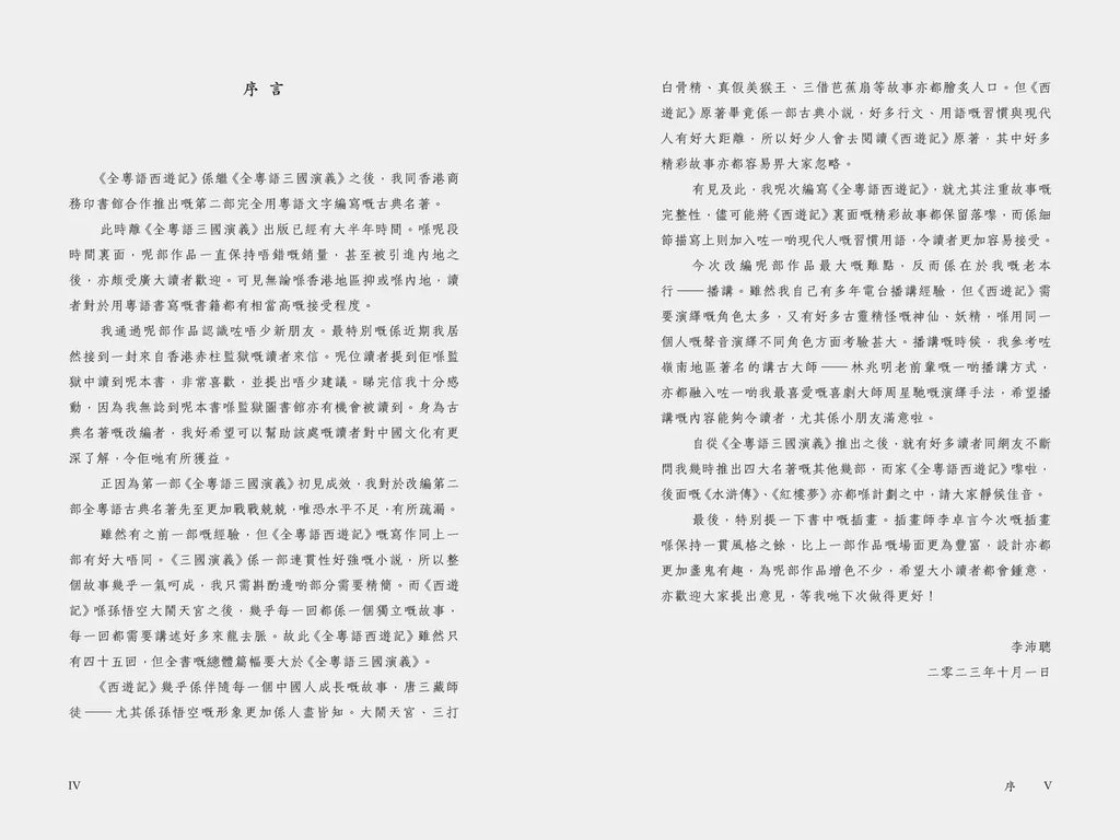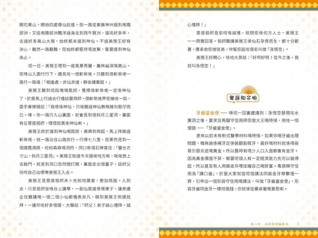 讀者在這本書中,能看到唐僧師徒取經路上不斷升級打怪,又能學到諸如「牙齒當金使」、「照板煮碗」等粵語俗語,更能瞭解「三皇五帝」、「文殊菩薩」、「打擊佛教」等等歷史文化常識。看經典故事,讀地道粵語,學傳統文化,一本《全粵語西遊記》即可滿足大家!