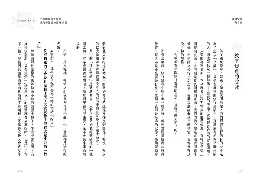 本書透過禪宗的靜心智慧,教你如何聰明地放下無止境的煩惱,好好傾聽自己的內心。我們或許無法改變外在的境遇,卻可以安頓自己的情緒,當你學會專注當下,隨遇而安,不論身體處於何處,心,都能得到平靜。