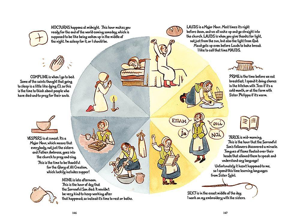 When her sister seizes the throne, Queen Eleanor of Albion is banished to a tiny island off the coast of her kingdom, where the nuns of the convent spend their days peacefully praying, sewing, and gardening. But the island is also home to Margaret, a mysterious young orphan girl whose life is upturned when the cold, regal stranger arrives. As Margaret grows closer to Eleanor, she grapples with the revelation of the island’s sinister true purpose as well as the truth of her own past. When Eleanor’s life is threatened, Margaret is faced with a perilous choice between helping Eleanor and protecting herself. In a hybrid novel of fictionalized history, Dylan Meconis paints Margaret’s world in soft greens, grays, and reds, transporting readers to a quiet, windswept island at the heart of a treasonous royal plot.