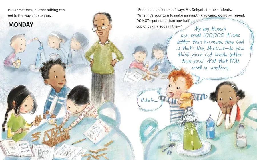 From the author-illustrator team behind The Invisible Boy comes a bright and lively picture book that captures the social dynamics of a busy classroom while delivering a gentle message about the importance of listening.