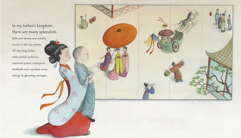A young Chinese princess is sent from her father’s kingdom to marry the king of a far-off land. She must leave behind her home of splendors: sour plums and pink peach petals and — most precious and secret of all — the small silkworm. She begs her father to let her stay, but he insists that she go and fulfill her destiny as the queen of Khotan. Beautifully told and arrestingly illustrated, here is a coming-of-age tale of a brave young princess whose clever plan will go on to live in legend — and will ensure that her cherished home is with her always.