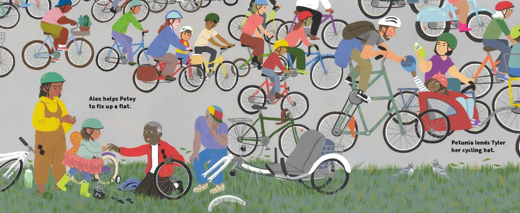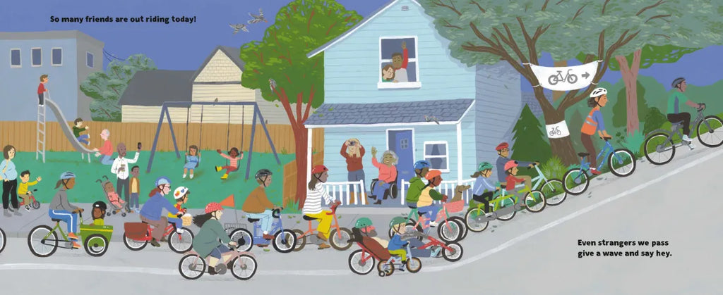 Before long, the bikes outnumber the cars and trucks, taking up more and more of the road until they form a parade of sorts, smiling and popping wheelies, ringing their bells, and celebrating the beautiful community they all share.