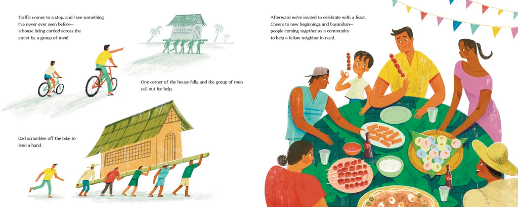 While Mateo learns more about this side of his father that he never knew, he also learns about bayanihan—people in the community coming together to help someone in need. When the trip comes to an end, it's difficult to say goodbye, but not only do Mateo and his dad bring home a stronger relationship as father and son, they also carry bayanihan back to their life in the city and strengthen the ties in their community.