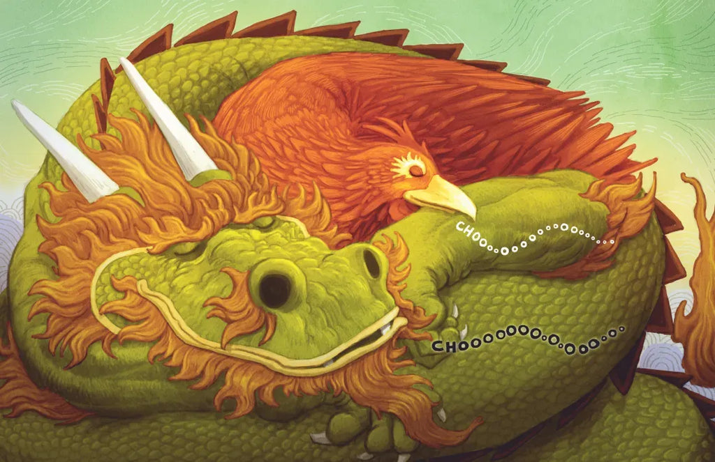 But this dragon can’t stop sneezing long enough to get a roar out. Even with friendly Phoenix insisting that Dragon get some rest, this powerful creature refuses to stop for any orange ginger tea or a drop of bone broth soup.
