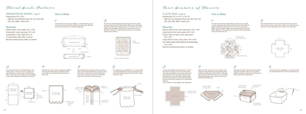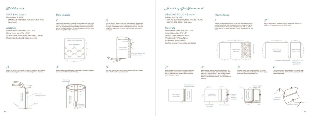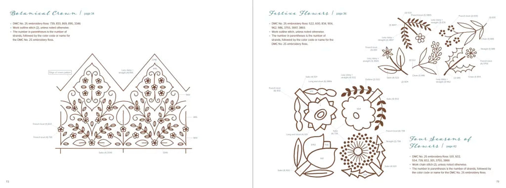 The guided projects for each pattern play on the fun, whimsical nature of the repetitive motifs. Fabric book covers with fences and fall-colored trees, a decorative vine crown, roses trailing down the sides of a tote bag, intricate floral bracelets—these projects and more will give any crafter plenty of creative space to bring these beautiful designs into their home. Each pattern and project comes with step-by-step instructions displayed in beautiful full-color photography, including stitch types, thread colors, stitch order, and various material suggestions.