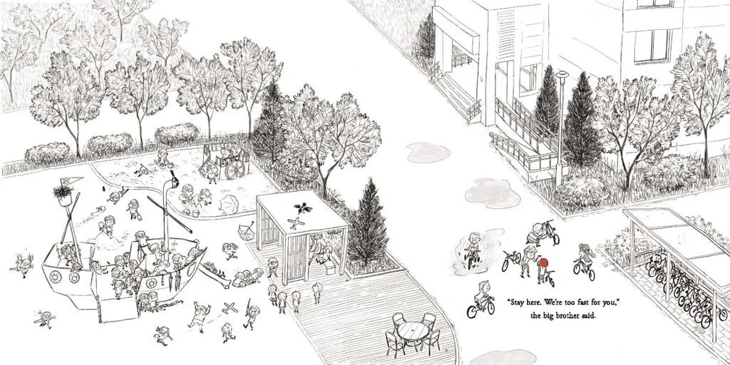A MOVING KOREAN PICTURE BOOK ABOUT A LITTLE BOY LEFT BEHIND BY HIS BIG BROTHER ON A BIKE RIDE, WHO MAKES FRIENDS WITH A SNAIL AND LEARNS TO GO AT HIS OWN PACE.