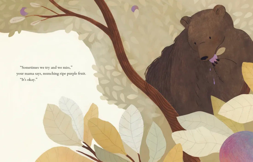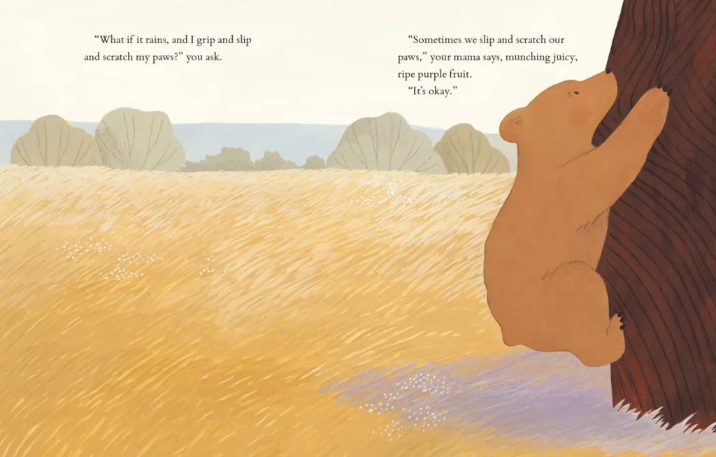 Sometimes you want to eat a juicy red plum at the top of a tree, but it seems so hard. What if you start the climb and a strong wind blows and the tree shakes? What if it rains and you slip and FALL? But those  sweet-smelling, juicy, ripe purple plums up there look so tasty, and best of all, Mama is waiting for you with words of encouragement. . . .