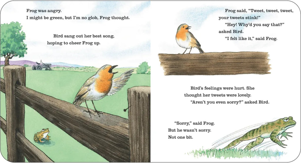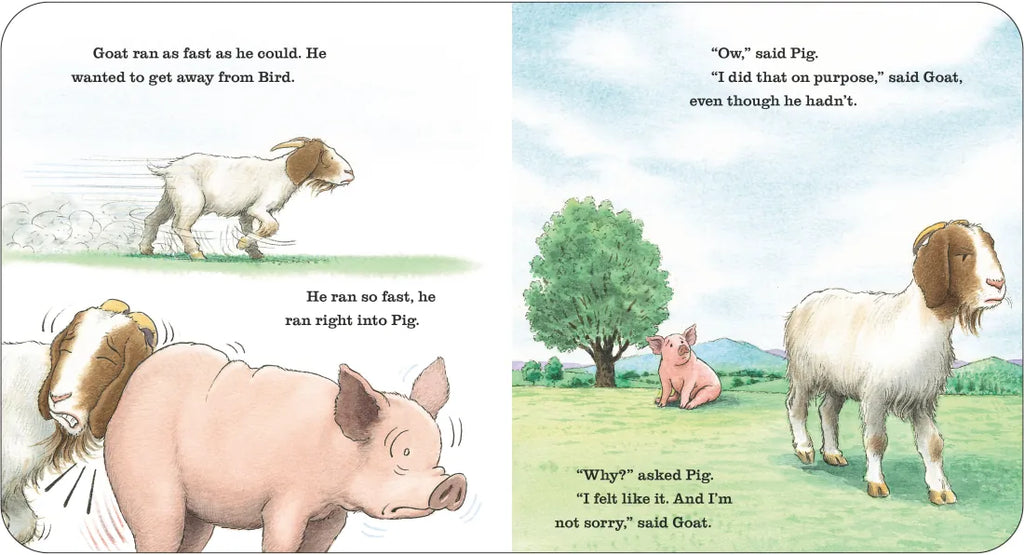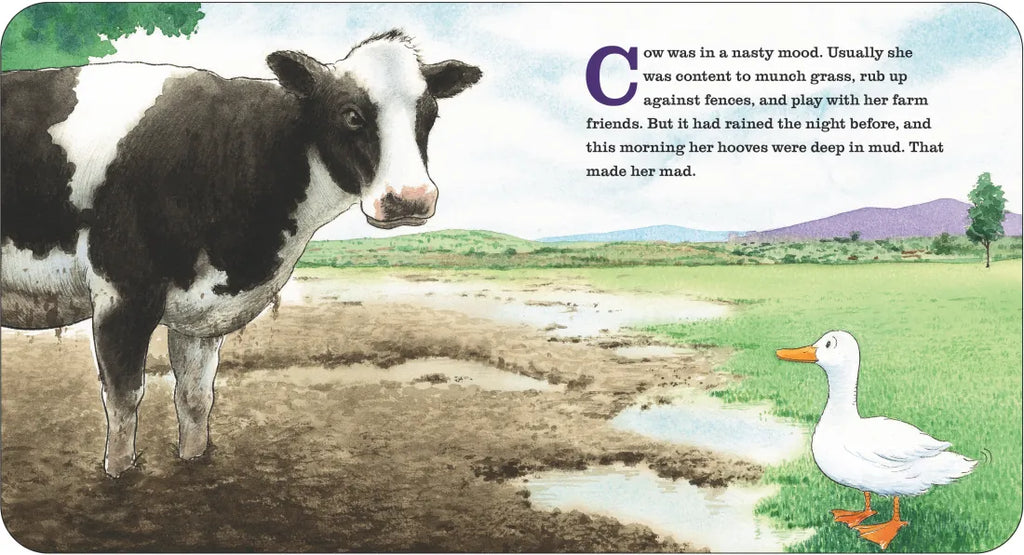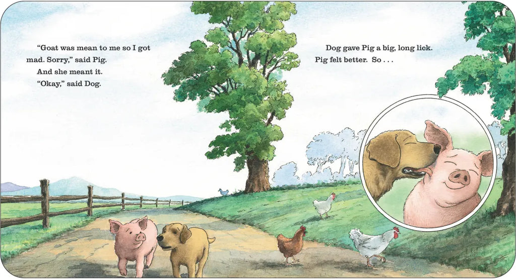 Little did Cow know that her bad mood would spread to the whole farm. But it does when Cow passes her anger along to Duck who takes it out on Frog who is mean to Bird who upsets Goat who bothers Pig. Until good-hearted Dog turns things around by showing kindness to Pig, turning not sorry into sorry (really sorry). But will that be enough to mend all of the hurt feelings on the farm?