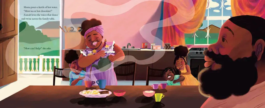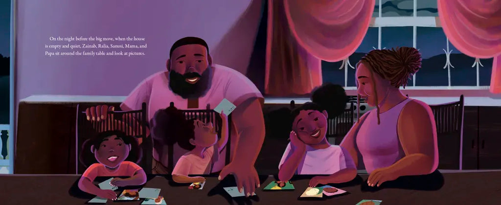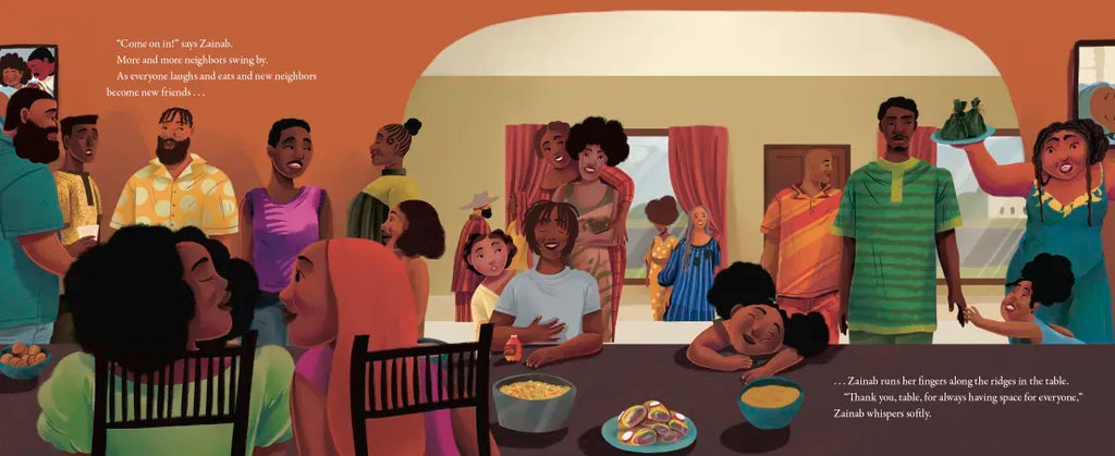 When Zainab runs down the stairs in the morning, she knows what she'll find: Papa cooking at the stove, Mama pouring tea, and then everyone gathering around the family table. Neighbors stop by, and there's plenty of room for them, too. There are so many beloved rituals that happen at the table: homework and crafts, aunties coming to plait hair, and festive gatherings with neighbors and relatives. But soon boxes start piling up around the house, and Zainab worries about the move—will the rituals feel the same in her new home?