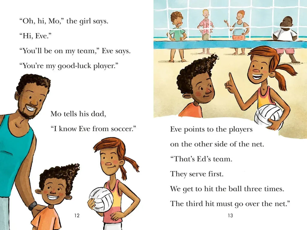 Mo and his parents are enjoying a sunny day at the beach! When the water is too cold to swim, Mo and his dad go for a walk and run into some of Mo's friends who are playing volleyball. After learning the rules, Mo and his dad join in to serve, set, and spike the ball. When the score is tied, will the smallest boy on the team be able to secure the game-winning point?