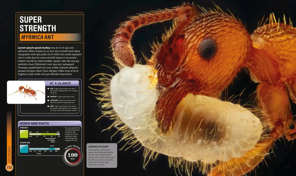 This stunning visual feast incorporates jaw-dropping photography, at-a-glance facts, amazing statistics, dashboard-style profiles, and expert information to give you an unprecedented insight into the complex life of creepy crawlies.