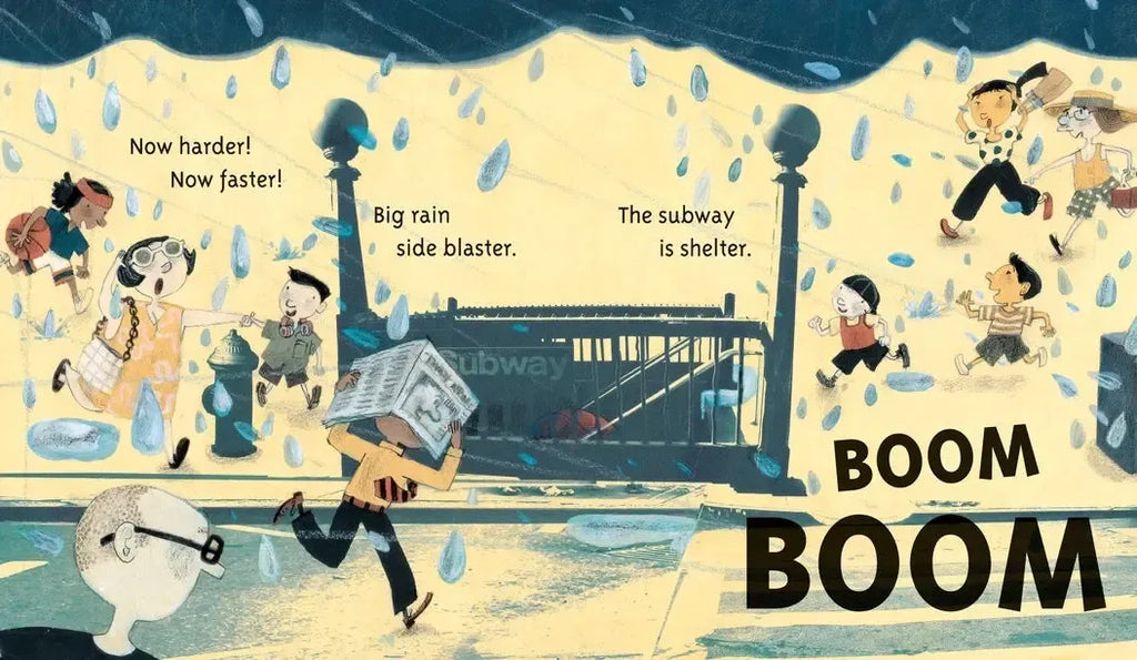 The clouds are gathering above a city street and soon — tap, tap, boom, boom! As a thunderstorm rolls in, people of all stripes race to get away from the crackling rain and wind. With quirky wordplay and infectious rhymes, Elizabeth Bluemle crystallizes an unexpected moment of community, while G. Brian Karas’s warm illustrations show the smiles to be had when a storm brings strangers together as friends.