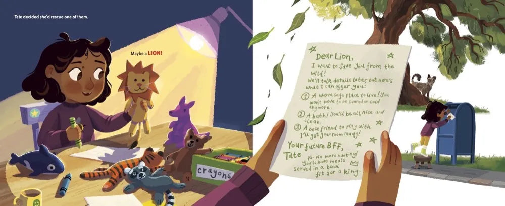 She is determined to help and comes up with the perfect plan: she’ll offer one a better life and they will be best friends! To her surprise, none of the wild animals she invites to live with her are impressed with her offerings—Orca is not interested in the kiddie pool, and Tiger would rather hunt than settle for cookies. Maybe Tate will have to look a bit closer to home to find her pawsitively perfect match.