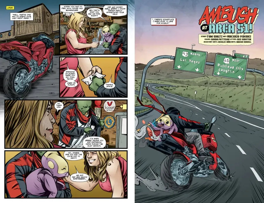 After the events of “The Armageddon Game,” the Turtles have found themselves at a crossroads, attempting to keep their family united while individually feeling the need to break away and explore life in a world that knows about mutants. To clear his head, Raphael jumps on his motorcycle and heads west on a solo road trip with the wind at his back and no destination in mind…until a dormant enemy out for revenge on the Turtles engineers a dangerous detour to Area 51. When Raphael is held hostage with some unexpected old friends, his soul-searching quest mutates into a crisis as he brawls in the desert to keep the E.P.F.’s cache of coveted technology out of the wrong hands. Will Raphael find his new purpose away from his brothers…or just more trouble than he can handle alone in “Ambush at Area 51!” by writer Tom Waltz and artist Vincenzo Federici?