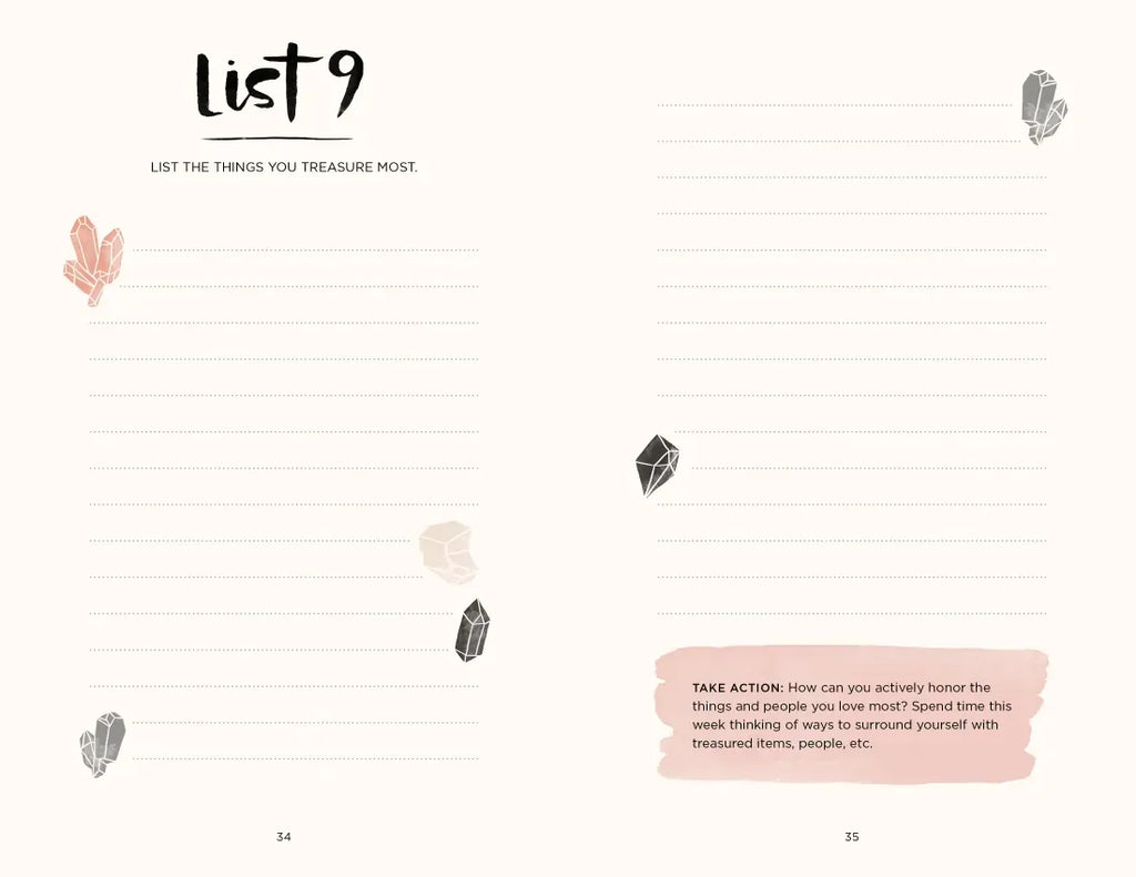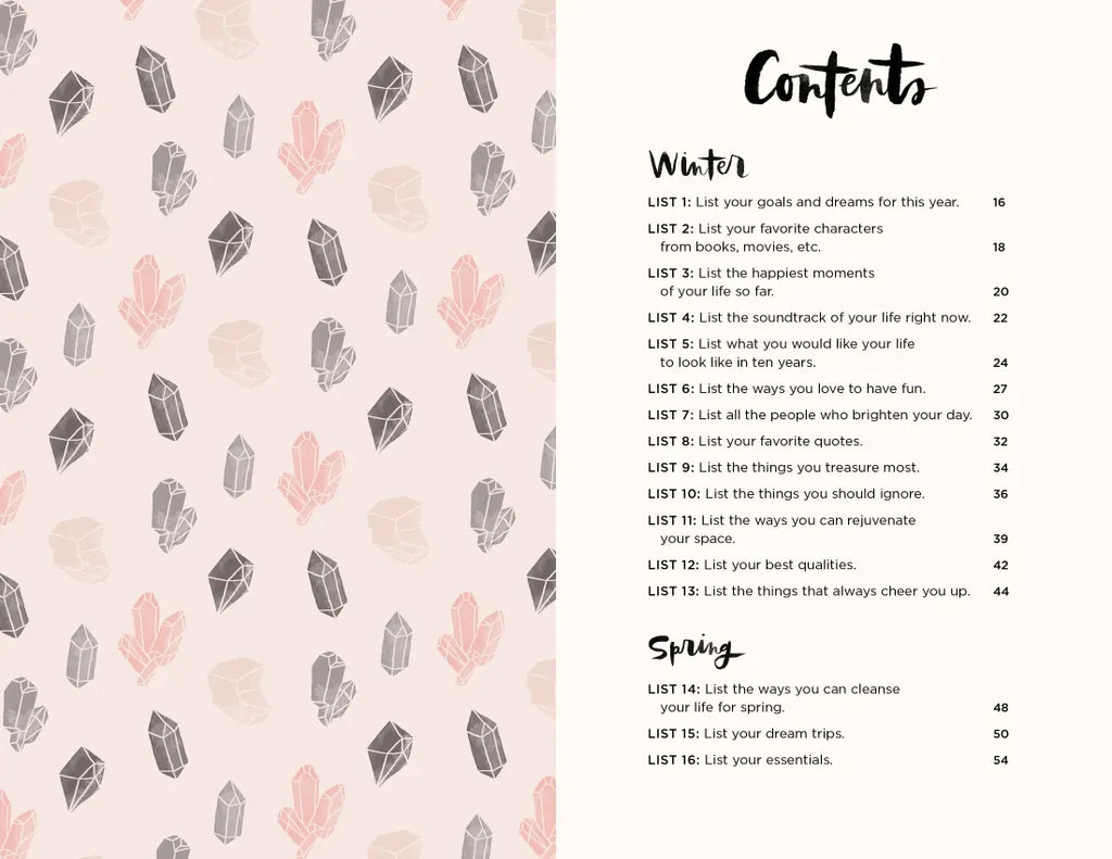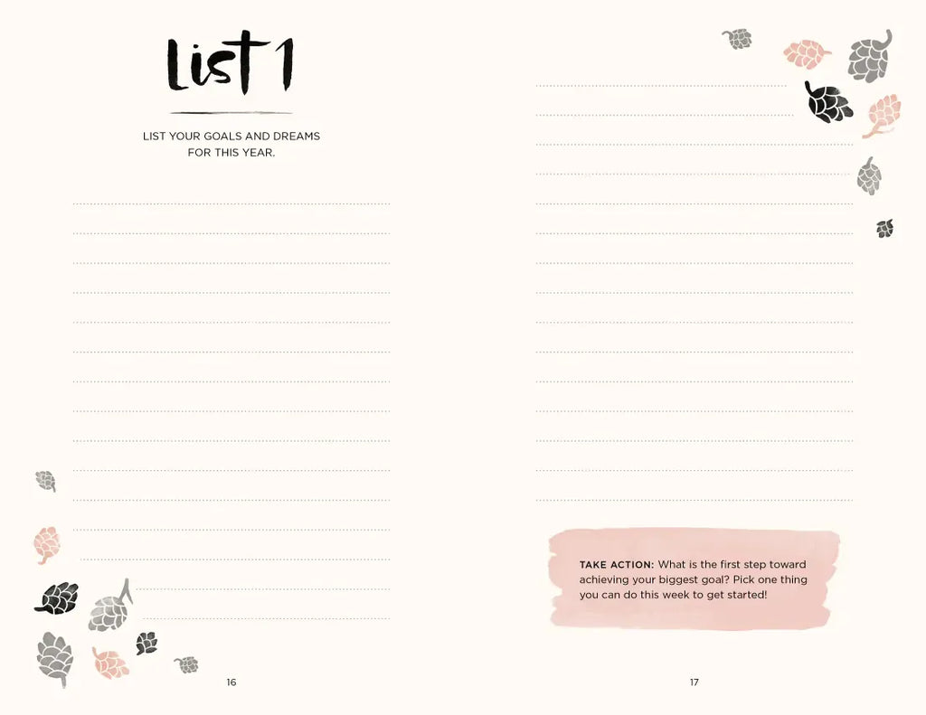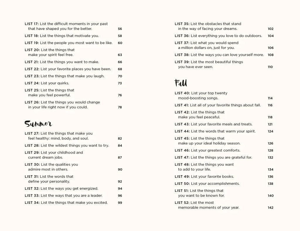 Create 52 lists, one for every week of the year, in this gorgeous undated journal designed to nurture self-expression and personal growth. Organized by season, each section includes list prompts that meet you right where you are—challenging you to take action and make your dreams a reality. Each list includes plenty of room for personal reflection. List prompts include: