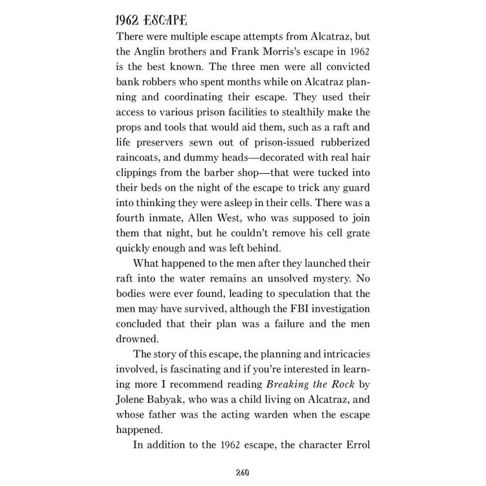 "Emily, her friend James, and her brother Matthew travel to Alcatraz for an elaborate puzzle competition based on an original mystery by Errol Roy, a famously reclusive San Francisco writer. Series fans will enjoy following these likable young sleuths to Alcatraz Island, a distinctive setting for a mystery." ―Booklist