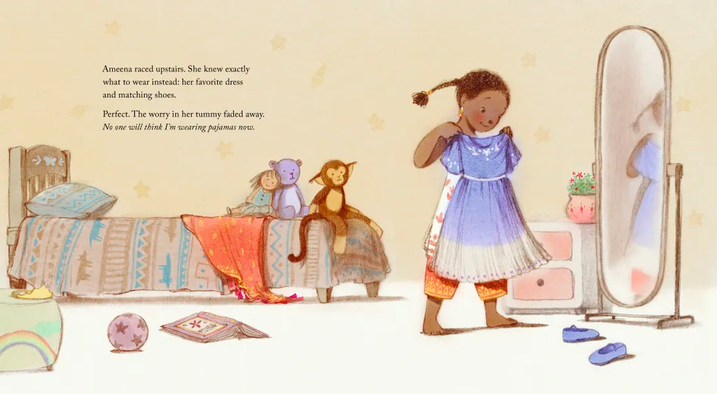 Ameena can’t wait for her aunty’s wedding. She is wearing a brand-new salwar kameez – the layers of floaty fabric filled with pretty patterns make her feel like a princess. But when someone comments on her “pyjamas”, she loses all confidence, fearing that her friends might not accept her traditional clothing. Through courage, family love and self-belief, Ameena discovers what it means to take pride in the beautiful layers of her heritage, especially in the face of difficult comments.