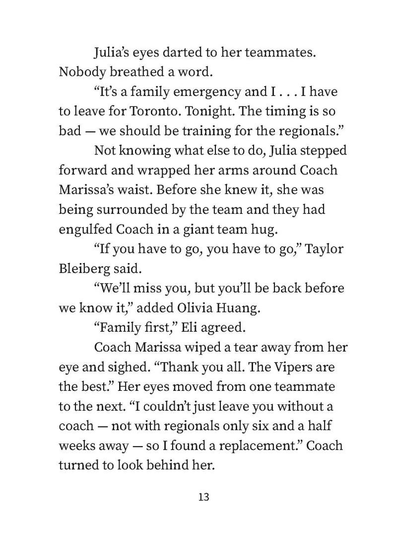 But then they learn that there's going to be a big increase in pool rental fees, which means the Vipers may lose practice days, or worse, not be able to swim at all. Julia takes the lead and gets the Vipers organized. Along the way, she learns more about her nemesis, teammate Olivia, and even Coach Nathan. Maybe first impressions aren't always the most accurate.