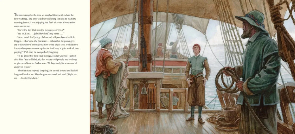 Leaving the docks of London on the Mayflower as an indentured servant to Pilgrim John Carver, John Howland little knew that he was embarking on the adventure of a lifetime. By his great good fortune, John survived falling overboard on the crossing of the Atlantic Ocean, and he earned his keep ashore by helping to scout a safe harbor and landing site for his bedraggled and ill shipmates. Would his luck continue to hold amid the dangers and adversity of the Pilgrims’ lives in New England? P.J. Lynch captures this pivotal moment in American history in precise and exquisite detail, from the light on the froth of a breaking wave to the questioning voice of a teen in a new world.