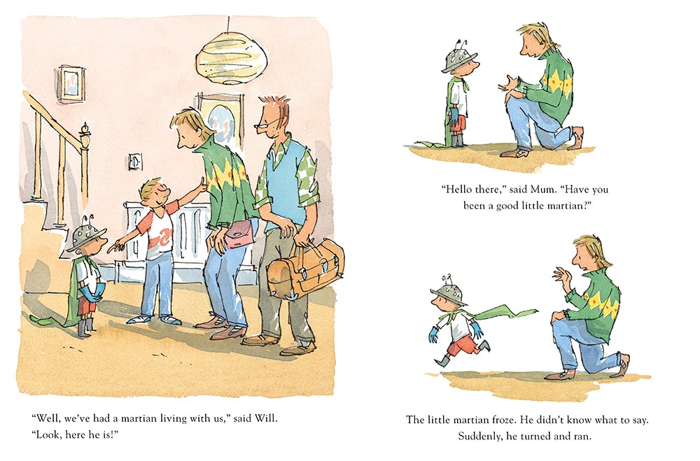 On the day that Stanley’s mom takes a work trip overnight, Stanley decides to leave planet Earth. But when his spaceship touches down again in the backyard, a young martian crawls out, proclaiming to Stanley’s dad that residents of Mars don’t wash before dinner, eat their vegetables, or brush their teeth. It just so happens that martians tend to act out in school, too. . . . With whimsy and sympathy for a familiar dilemma, Simon James ushers us into the coping fantasies of an imaginative, sensitive kid — and shares the pleasure of his sheepish reunion with a most accepting family.