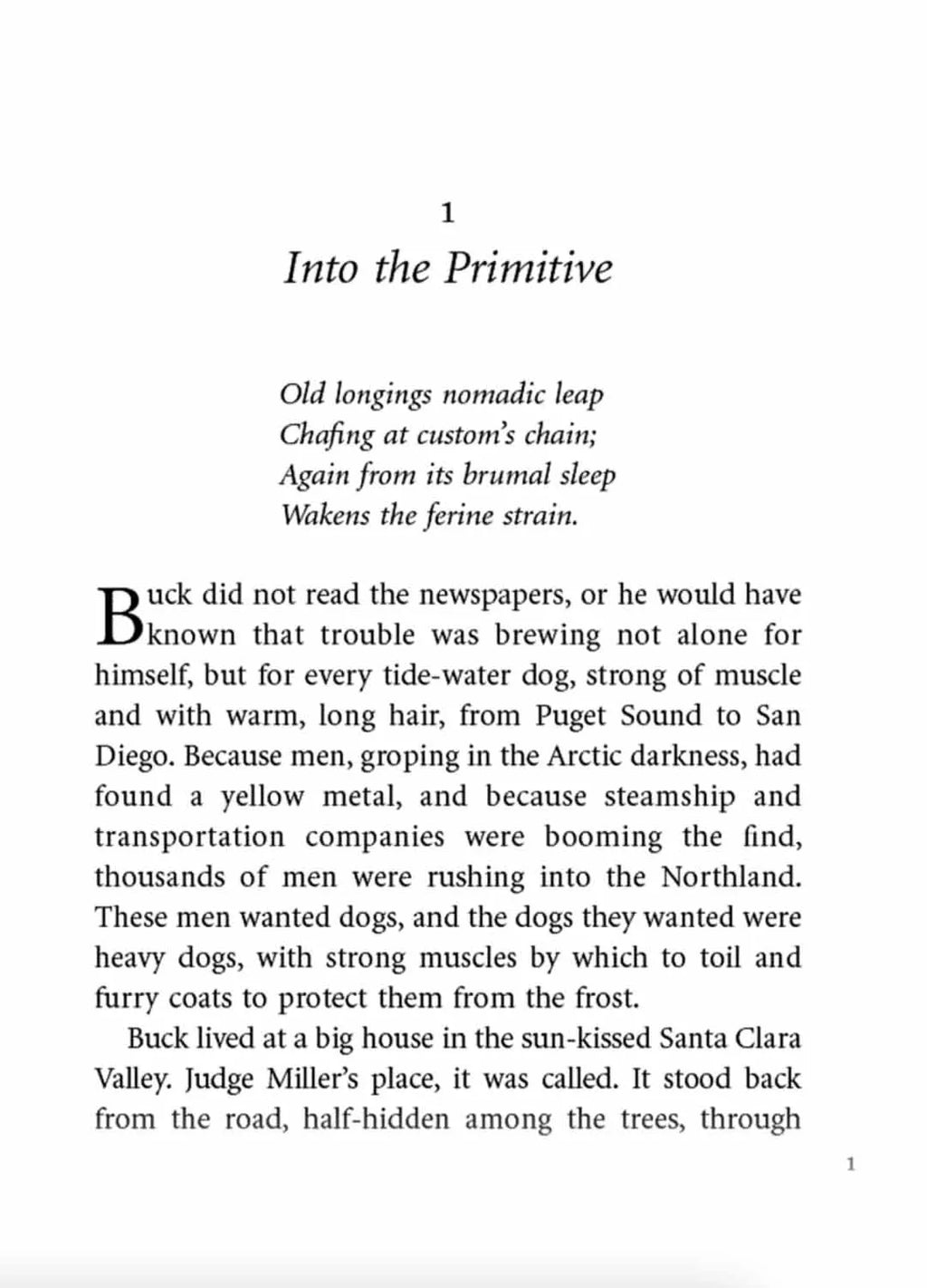 The Call of the Wild tells the story of the magnificent dog, Buck, who’s loyalty is tested by cruel men in search of gold in the Klondike. Brutally treated, Buck finds the blood of his wolf ancestors rising within him and breaks free to roam the Alaskan wilderness as leader of a pack instead of as a pawn in his owner’s ruthless mission.