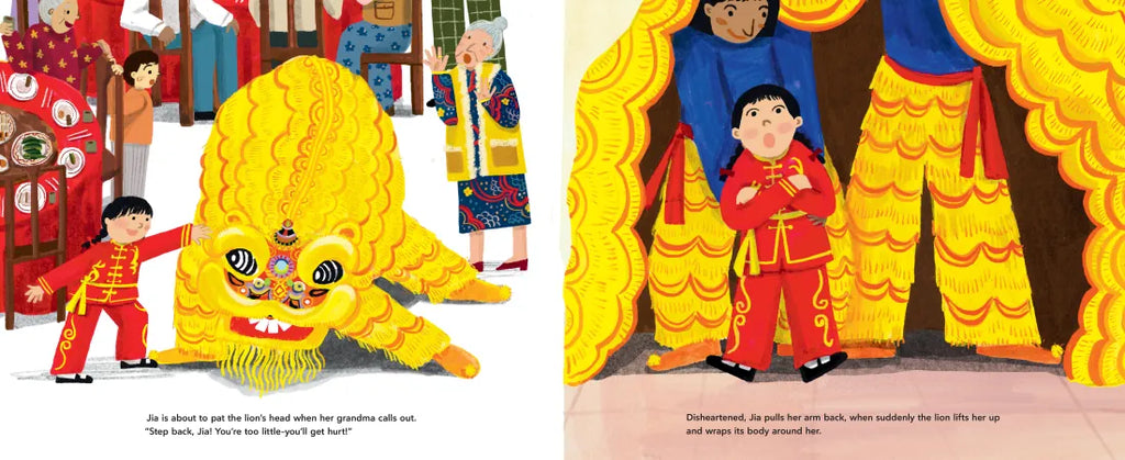 Jia’s family is busy preparing for the Chinese New Year feast at their restaurant in Chinatown, and Jia wants to take part. But each time she tries to help she’s told that she’s too young: too young to be in the kitchen, too young to light the lanterns, too young to carry the plates. And then the feast begins, and something wonderful happens. When Jia is scolded for getting too close to the exciting lion dance, one of the dancers swoops her up and into the costume, and suddenly she’s a part of the performance—a crucial part that saves the show. Never again does her family tell her that she’s too young to help!