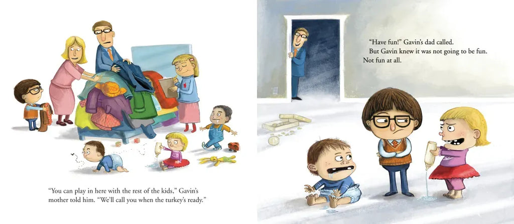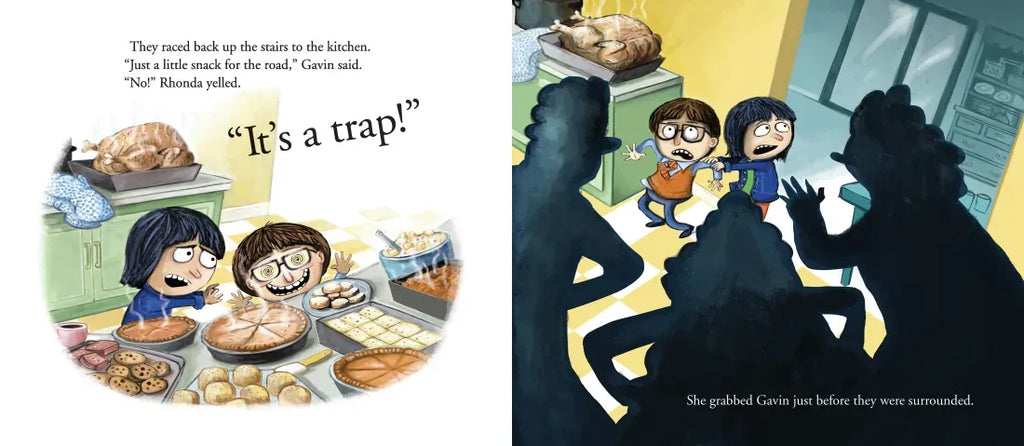 It’s another Thanksgiving at Grandma’s. Gavin expects a long, boring day full of pesky toddlers, but his cousin Rhonda has a different idea: make a break for it to the swing set in the backyard! Gavin isn’t so sure, especially when they encounter vicious guard dogs (in homemade sweaters), overly affectionate aunts, and worst of all, the great wall of butts. Can they avoid all the obstacles and find some fun before turkey time?