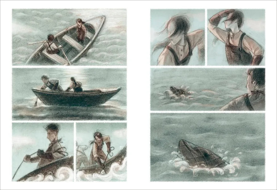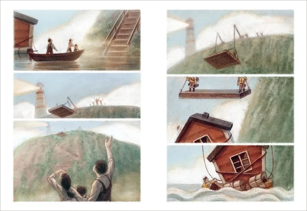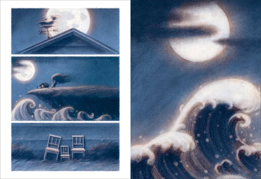 In this gorgeous, wordless story, a family makes their home on a cliff overlooking the sea. They live peacefully, spending their days exploring the ocean and filling their home with warmth and laughter. But as seasons pass, the waters rise, bringing the tides closer to the clifftop and the house. When a powerful storm rages and giant waves engulf the cliff, the family must leave—but not without their beloved home.