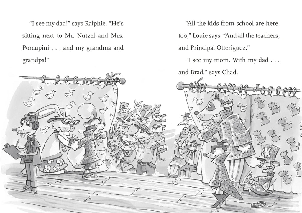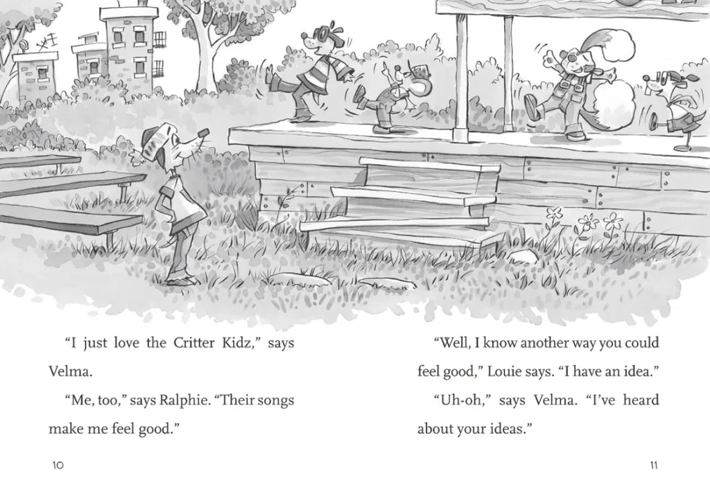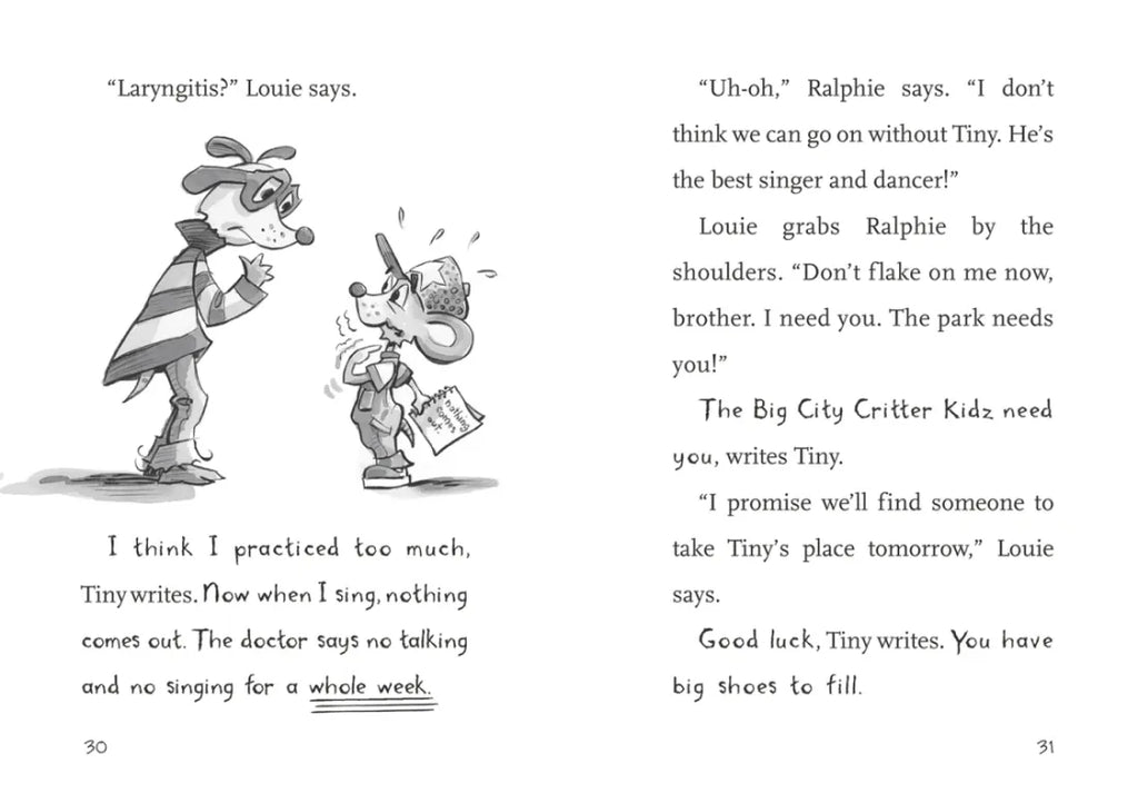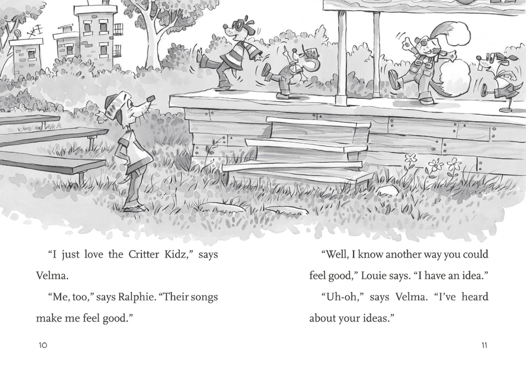 When Louie and Ralphie Ratso see their friends singing and dancing in the run-down band shell in the Big City Park, Louie gets one of his big ideas. They’ll put on a concert to raise money to improve the park! But as Ralphie, Tiny, Velma, and Millicent plan a repertoire by the Critter Kidz, their favorite pop group, featuring costumes full of glitter and sequins, Chad Badgerton teases and says they look “girly”—making Ralphie self-conscious about being in the group. Why is being girly a bad thing? Then Tiny, their lead singer, loses his voice, and the gang worries that the concert won’t happen at all—until Ralphie and Louie discover that Chad has a secret fan stash of his own. Can Ralphie muster enough confidence to help Chad find his? Fans of the Ratsos as well as readers new to the series will be tickled and heartened by this latest adventure.