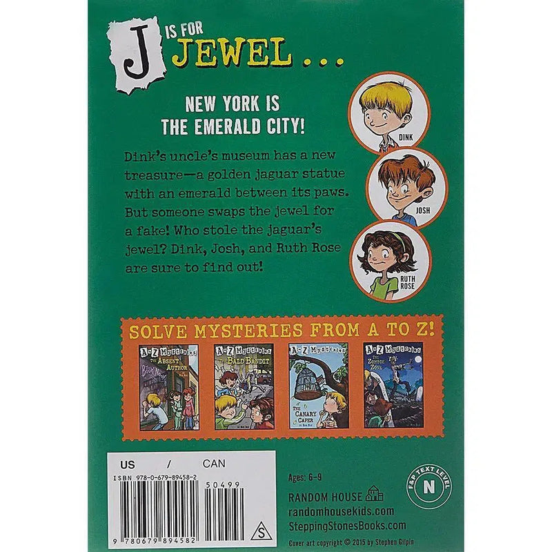 J is for Jewel . . . New York is the emerald city! Dink’s uncle’s museum there has a new treasure—a golden jaguar statue with an emerald between its paws. But someone swaps the jewel for a fake! Who stole the jaguar’s jewel? Dink, Josh, and Ruth Rose are sure to find out!