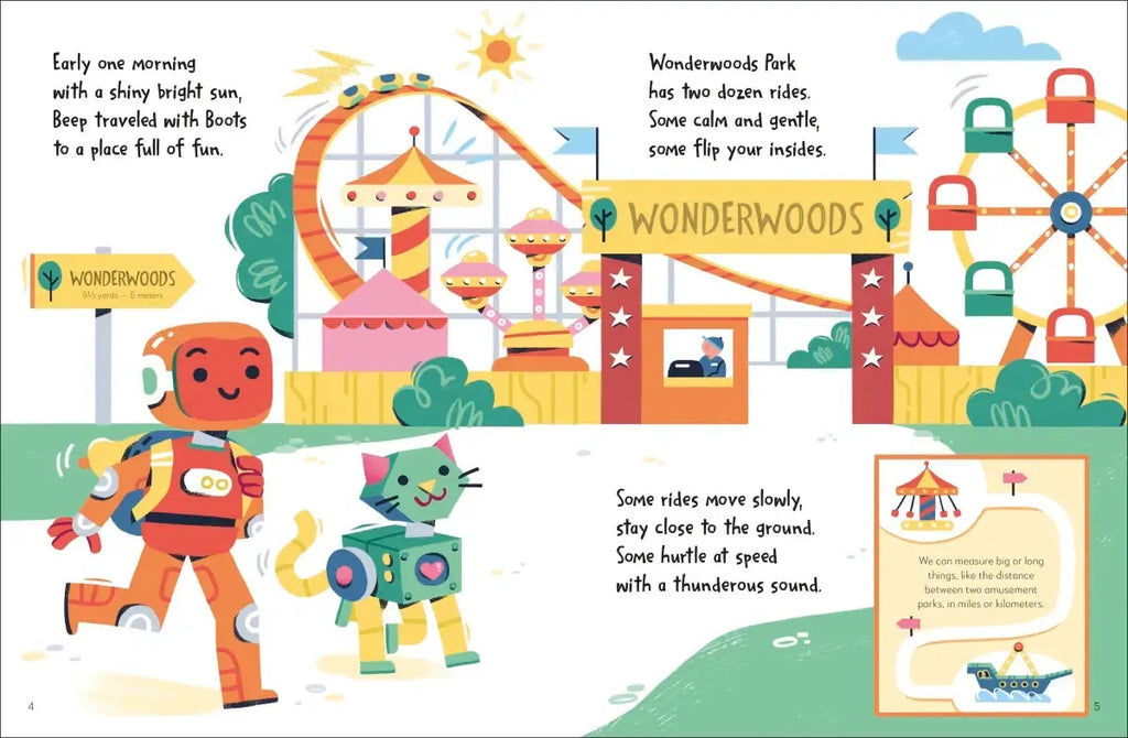 The characterful illustrations and rhyming text in the pages of this book bring Beep and Boots to life! Children aged 5–7 will love seeing the adventures the robot duo go on and will learn key mathematical concepts about measuring in a gentle, fun way. A series of questions at the end of the book reinforce learning and encourage kids to look at the math they can see in the world around them.