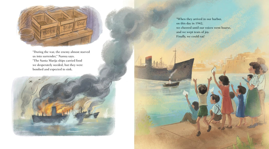 Every year, a young girl visits her Nanna on the tiny Mediterranean isle of Malta, and together they bake a cake. As they mix, stir and ice their chocolate confection, Nanna explains why the cake is so special: when she was a girl, she made it to celebrate the end of a WWII bombing campaign against her small country.