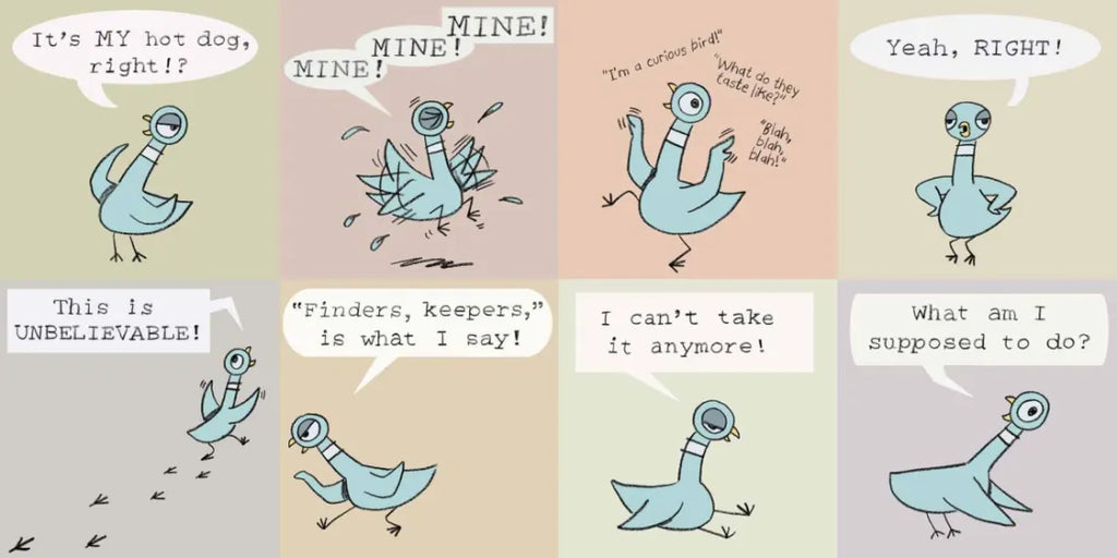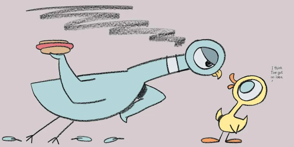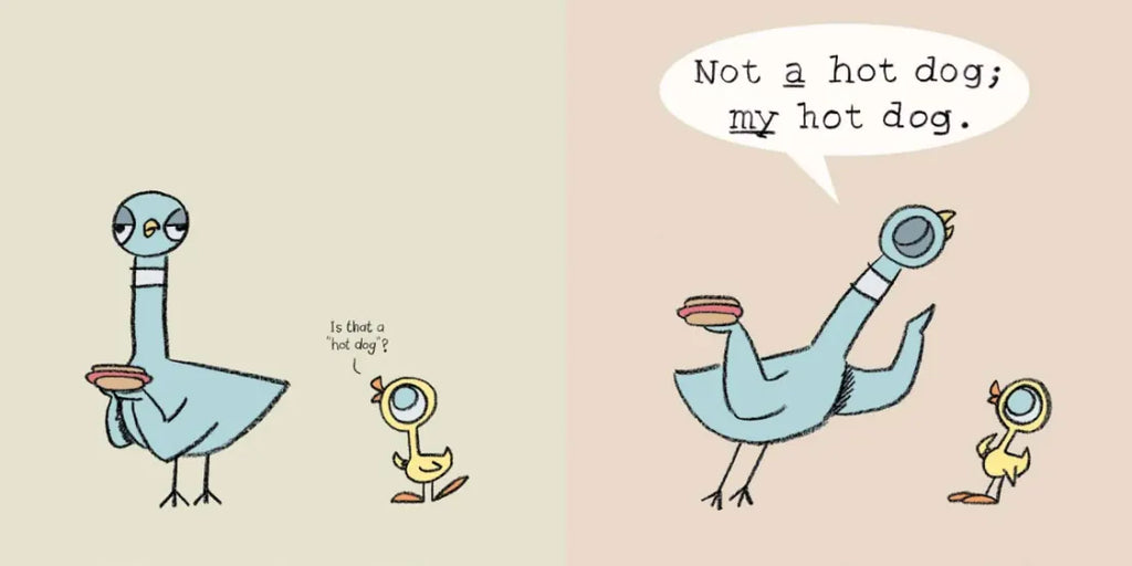 When Pigeon finds a delicious hot dog, he can hardly wait to shove the entire thing in his beak. But . . . then a very sly and hungry duckling enters the scene and wants a bite. Who will be the more clever bird?